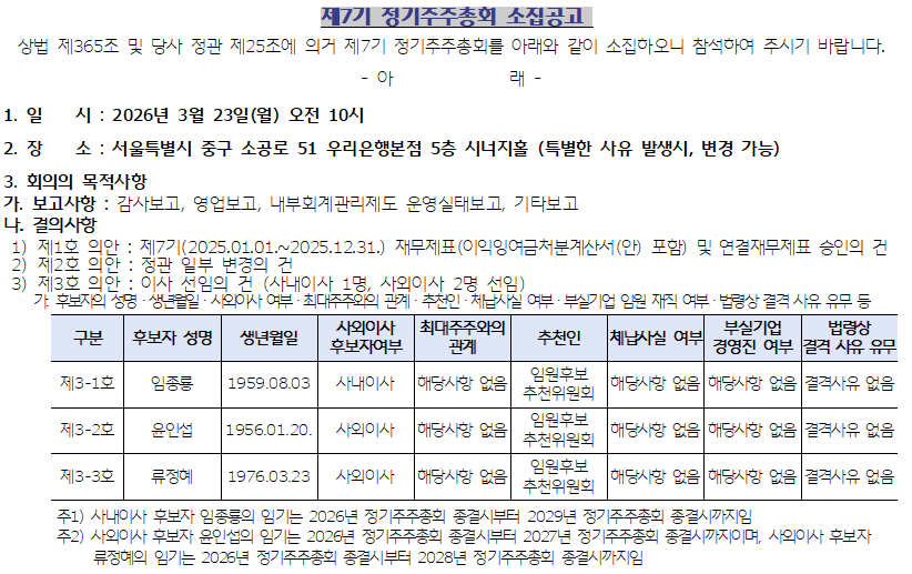 제7기 정기주주총회 의결권 대리행사 권유를 위한 참고서류 및 위임장