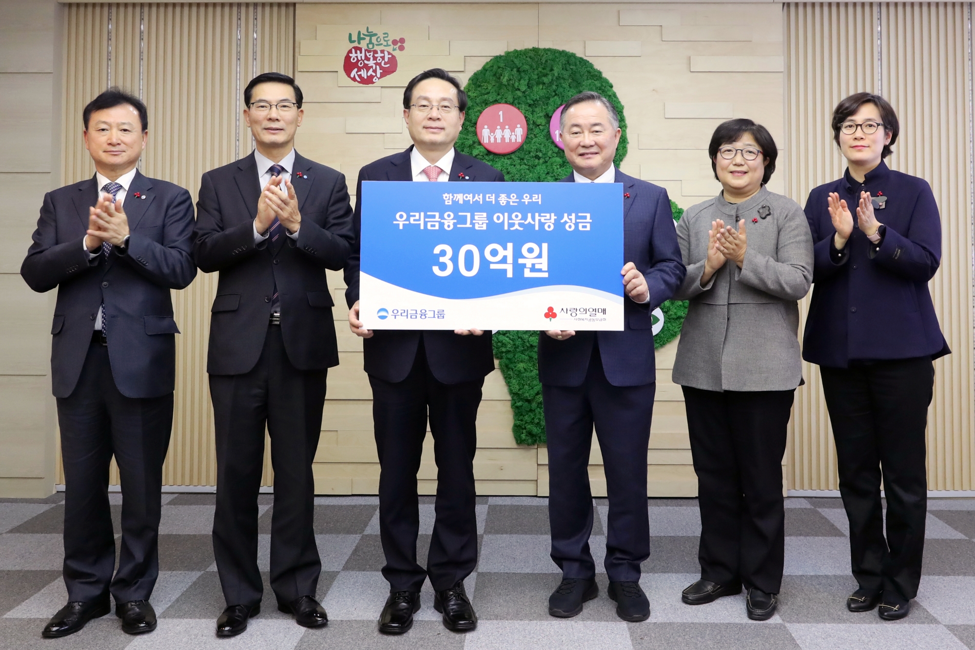 우리금융그룹(회장 손태승)은 나눔을 통한 행복한 사회를 만들기 위해 이웃돕기 성금 30억원을 사회복지공동모금회에 기탁했다고 14일 밝혔다.