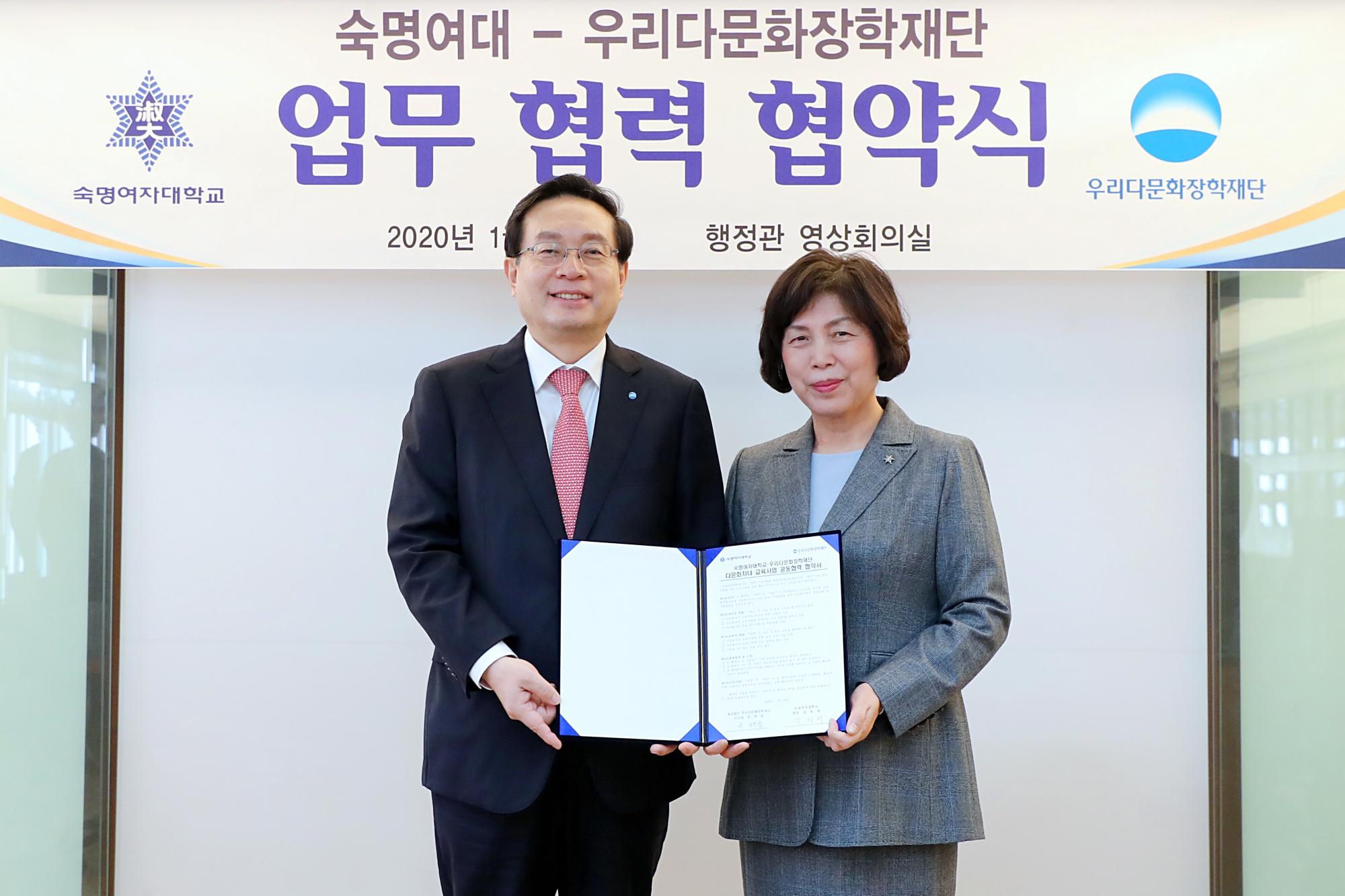 우리금융그룹 우리다문화장학재단(이사장 손태승)은 지난 15일 서울 용산구 소재 숙명여자대학교 행정관에서 숙명여자대학교와 다문화자녀 교육사업 공동협력을 위한 업무협약을 체결했다고 16일 밝혔다. 협약식에는 손태승 우리금융그룹 회장 겸 우리다문화장학재단 이사장, 강정애 숙명여자대학교 총장 등이 참석했다.