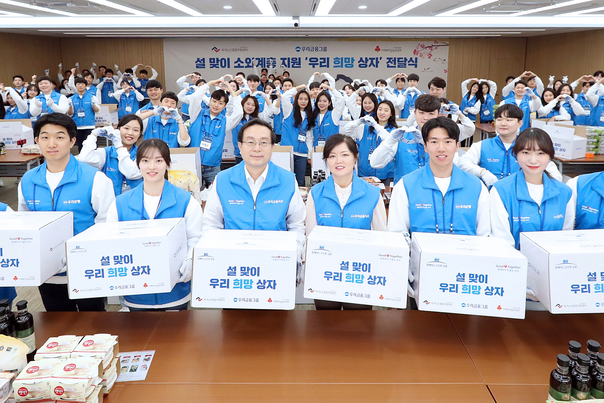 우리금융그룹은 어려운 이웃을 위해 매년 명절을 앞두고 나눔행사를 이어오고 있다. 이날 전달식에 참석한 손태승 우리금융그룹 회장과 김현미 독거노인종합지원센터 센터장은 2020년 우리금융그룹 신입직원 300여명과 함께 희망상자 3000개를 직접 제작했다.