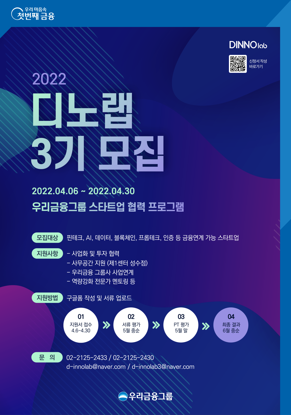 2022년 디노랩 3기 공개모집 참가신청은 이달 30일까지이며, 참여방법 및 프로그램에 대한 자세한 내용은 우리금융그룹 홈페이지를 통해 확인할 수 있다.
