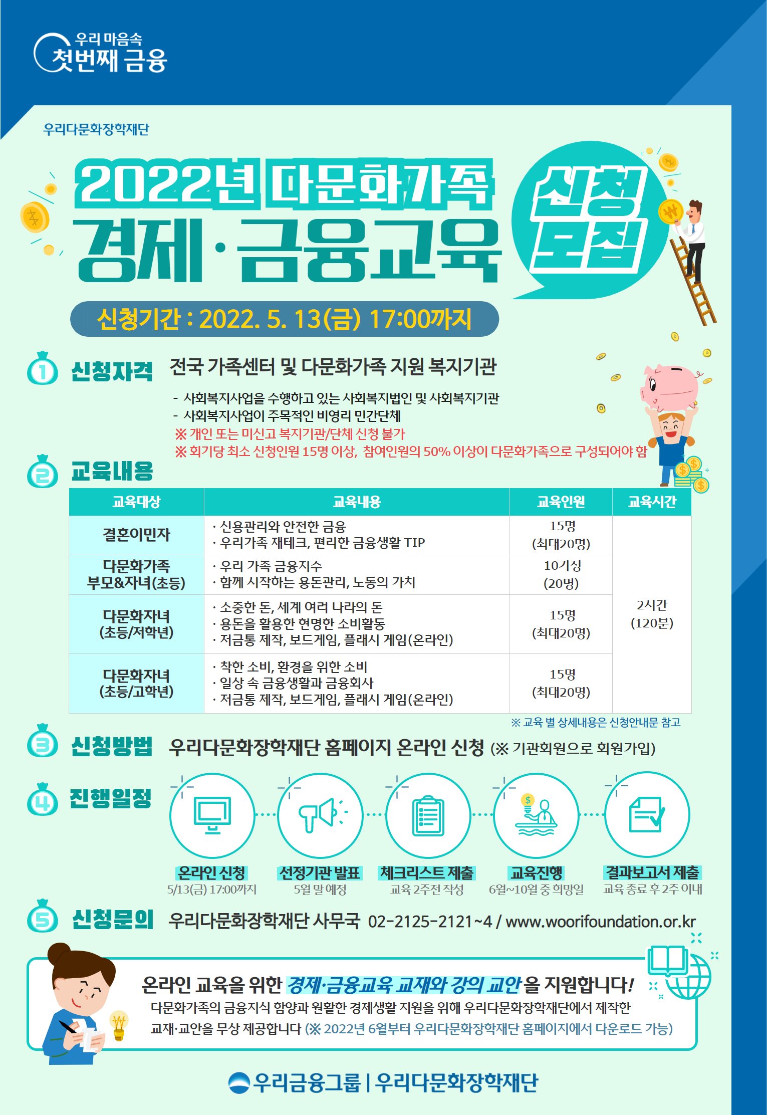 우리금융그룹 우리다문화장학재단(이사장 손태승)은 2022년 다문화가족 경제․금융교육 ‘우리금융 아카데미’에 참여할 다문화가족 지원기관을 모집한다고 29일 밝혔다.