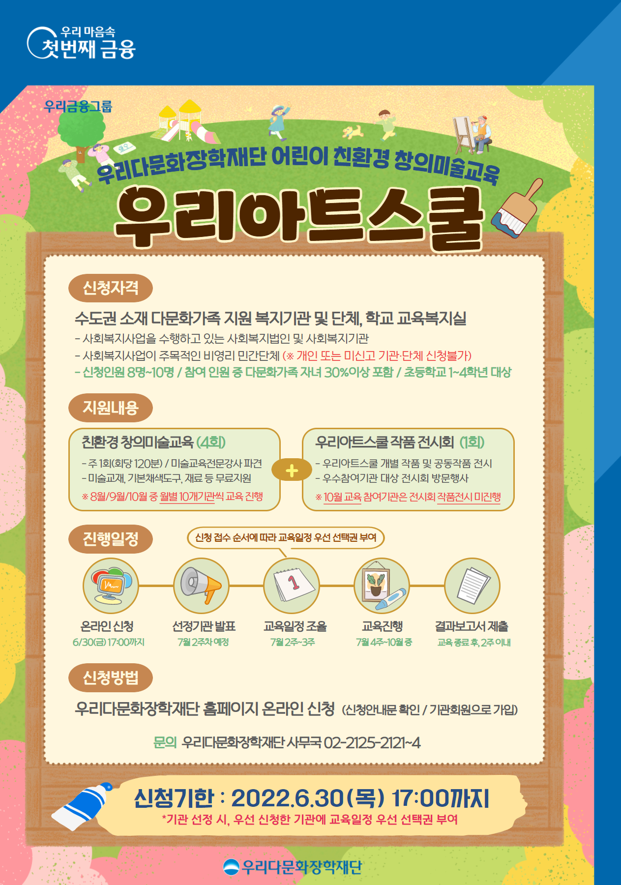 우리금융그룹 우리다문화장학재단(이사장 손태승)은 2022년 친환경 창의미술교육 ‘우리아트스쿨’에 참여할 다문화가족 지원기관을 모집한다고 17일 밝혔다.
