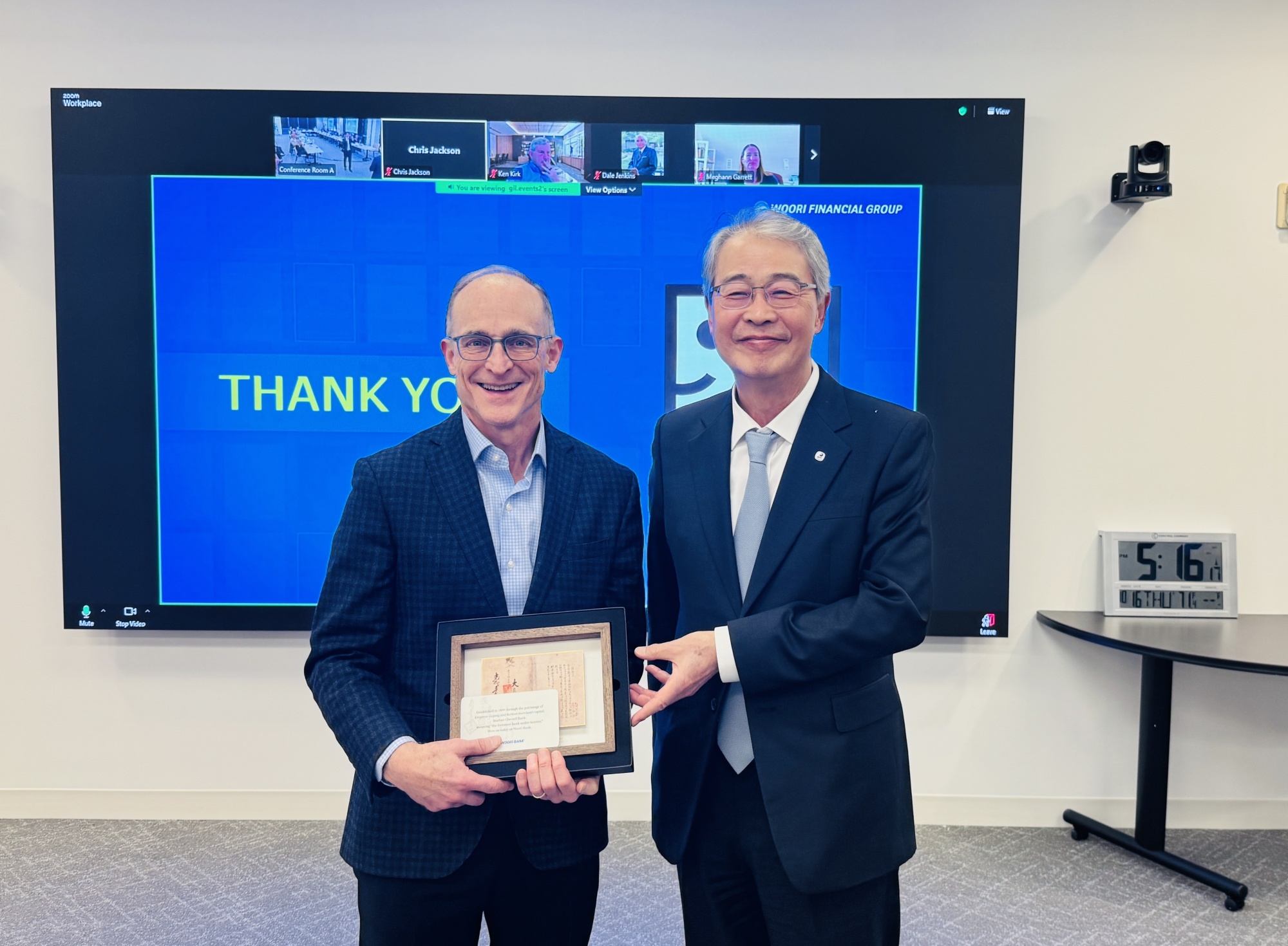 (왼쪽부터) GII 스티븐 프레스턴 대표이사와 우리금융그룹 임종룡 회장이 지난 16일 미국 메릴랜드주 록빌에 위치한 굿윌스토어 본사에서 기념사진을 촬영했다. 이날 임 회장은 대한천일은행 설립인가서 액자를 프레스턴 대표이사에게 선물했다.